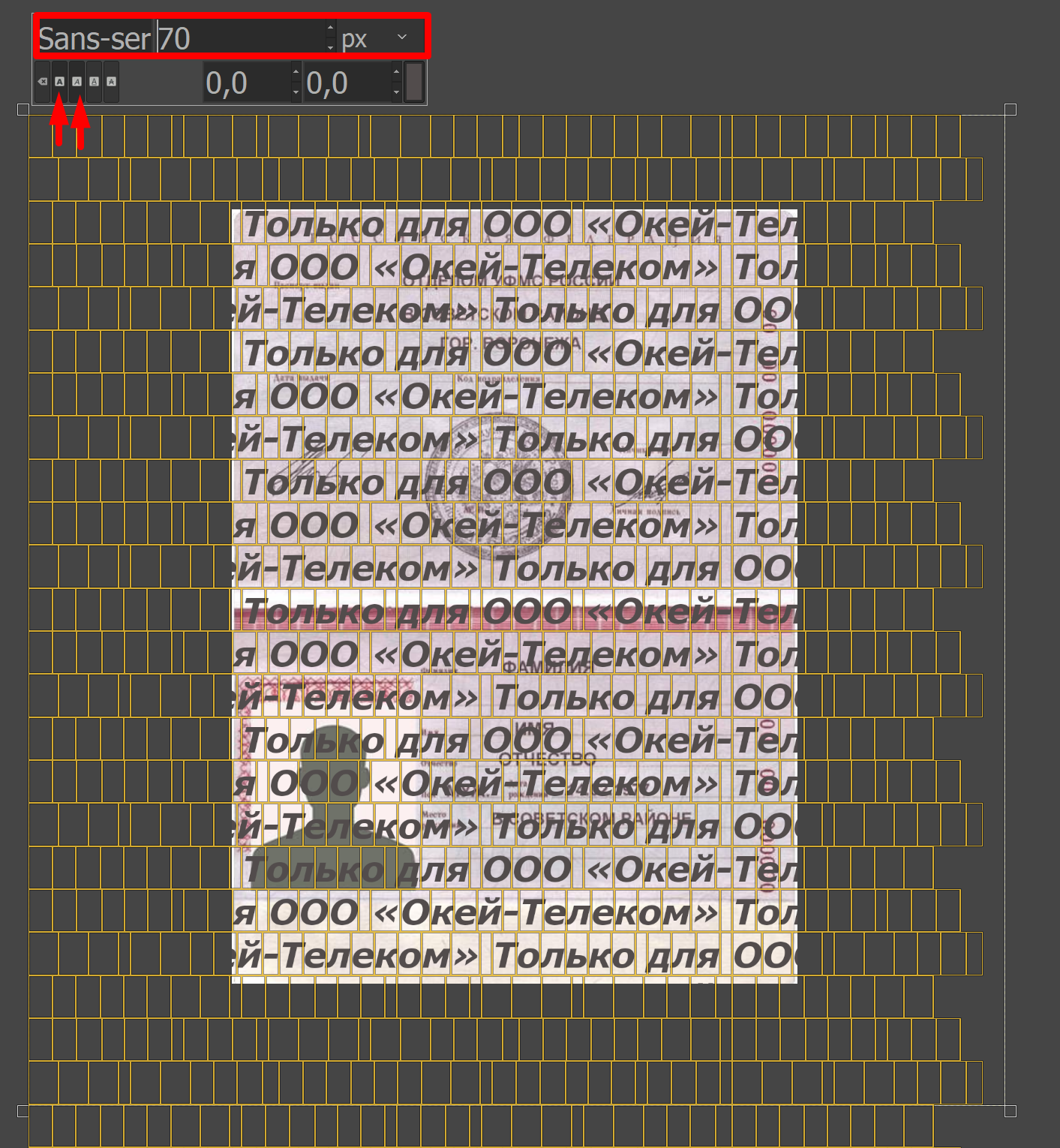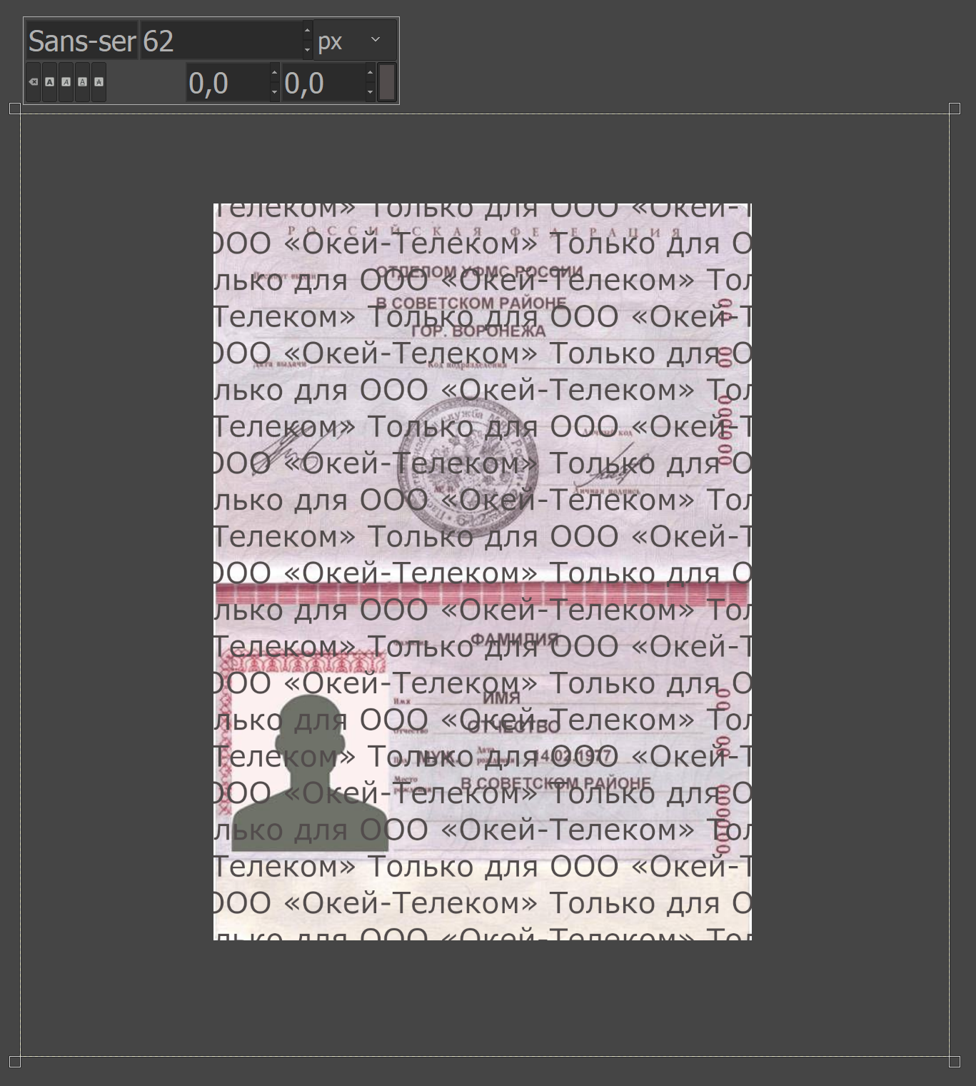 Далее введите желаемое слово или фразу, которые вы хотите использовать в качестве водяного знака. Чтобы защитить документ от неправомочного использования, выберите фразу, которая будет уникализировать изображение для конкретного сайта или сервиса. Таким образом эта копия не будет иметь никакой юридической силы при попытке использовать её для подтверждения ваших данных в любом другом месте. Рекомендуем заполнить всю область выделения, для этого будет удобно записать нужный текст отдельно, скопировать его, а затем вставить необходимое количество раз с помощью комбинации клавиш Ctrl+V.