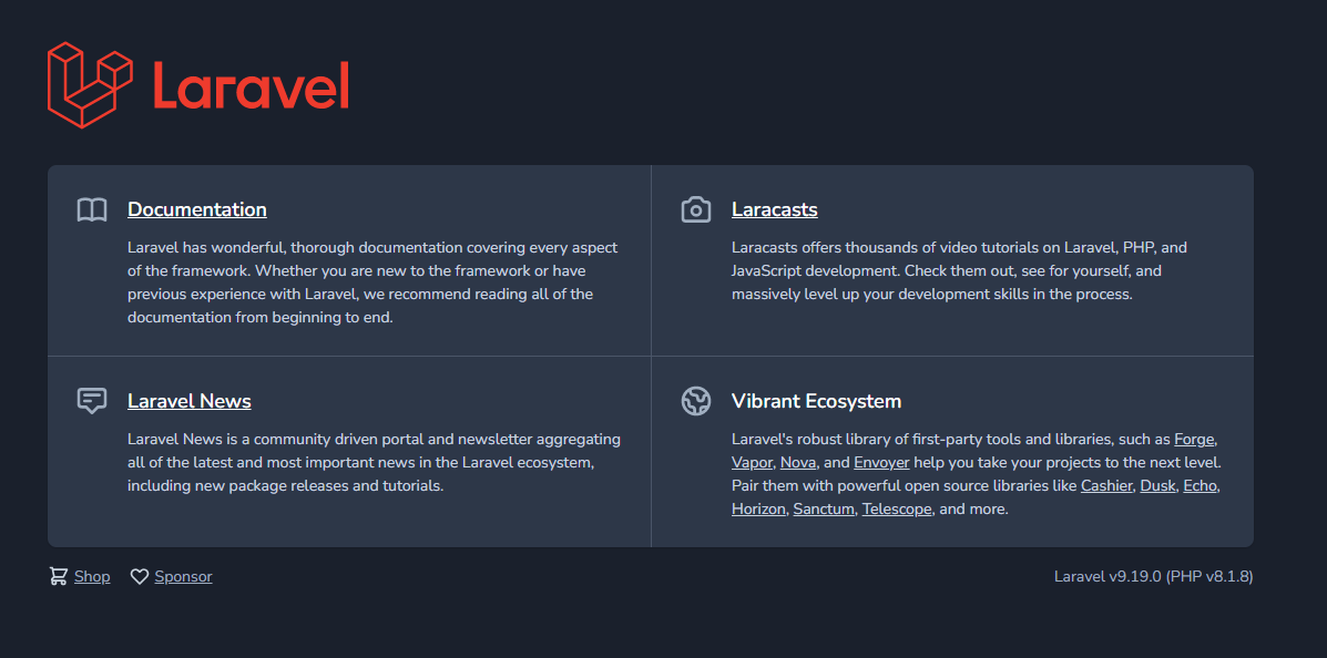 После завершения установки зайдите в каталог приложения и запустите команду Laravel's artisan, чтобы убедиться, что все компоненты были успешно установлены: