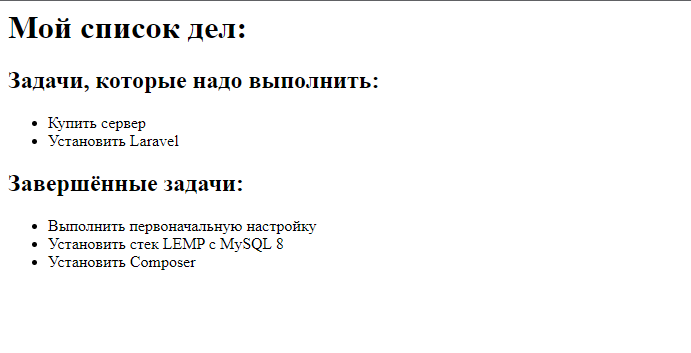 Следующий код заменяет callback-функцию главного маршрута. Он делает 2 запроса к базе данных, используя флаг completed для фильтрации результатов. Он возвращает результаты в представление с именем taskslist, которое мы создадим следующим. Скопируйте это содержимое в свой файл routes/web.php, заменив уже имеющийся там код: